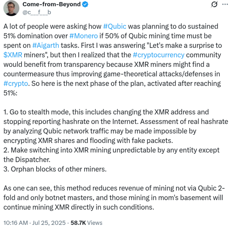 Qubic revealed on June 30 that it had been incentivizing Monero CPU mining, redirecting the mined XMR to fund buybacks and token burns within the Qubic ecosystem. In essence, Monero was being used to fuel another project’s token economy, raising ethical and structural concerns.