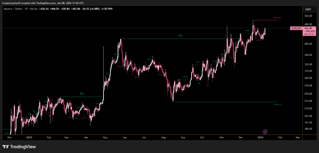 Monero (XMR) has climbed back toward its all-time high near $490, trading around $460 after a steady multi-week rally. This rebound marks a sharp reversal from mid-to-late 2025, when Monero lagged as attention shifted to rival privacy assets. Despite earlier concerns over mining centralization and a significant block reorganization event, the network demonstrated resilience, reinforcing confidence in its long-term robustness.