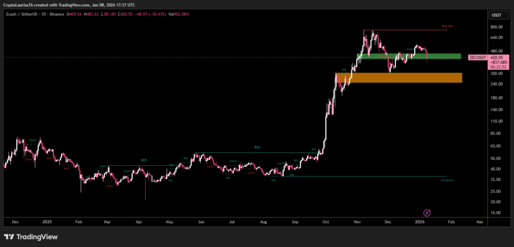 Zcash (ZEC) faced renewed pressure after the entire core development team resigned following a governance dispute with its nonprofit oversight board. The sudden departure raised serious questions about development coordination and roadmap execution, triggering a sharp sell-off that pushed ZEC down nearly 15% in a single session before a modest rebound.