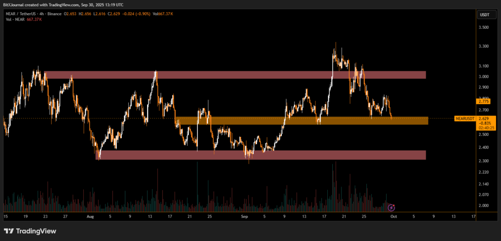 The $2.60 support region highlighted on the four-hour chart has emerged as a key battleground for traders. A sustained break below this level could expose NEAR to further downside, potentially pushing prices toward the $2.35–$2.40 demand zone. On the upside, resistance remains firm near $2.77, with stronger selling pressure seen in the $3.00–$3.10 range.