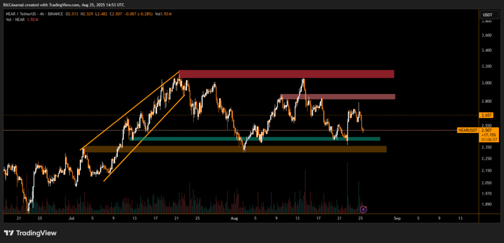 The price of NEAR Protocol (NEAR) dropped by nearly 7% in the last 24 hours, erasing recent gains and sparking concerns among traders. At the time of writing, NEAR is trading around $2.51, down from a recent local high near $2.80, according to the latest price charts.