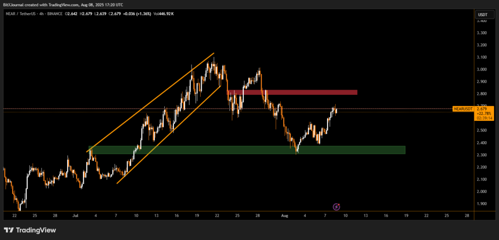 The 4-hour chart shows NEAR rebounding strongly from the $2.30–$2.40 support zone (green area), which previously acted as a launchpad for July’s rally. The move higher now brings the asset into proximity with the $2.75–$2.85 resistance region (red zone), a barrier that has capped upside moves in recent weeks.