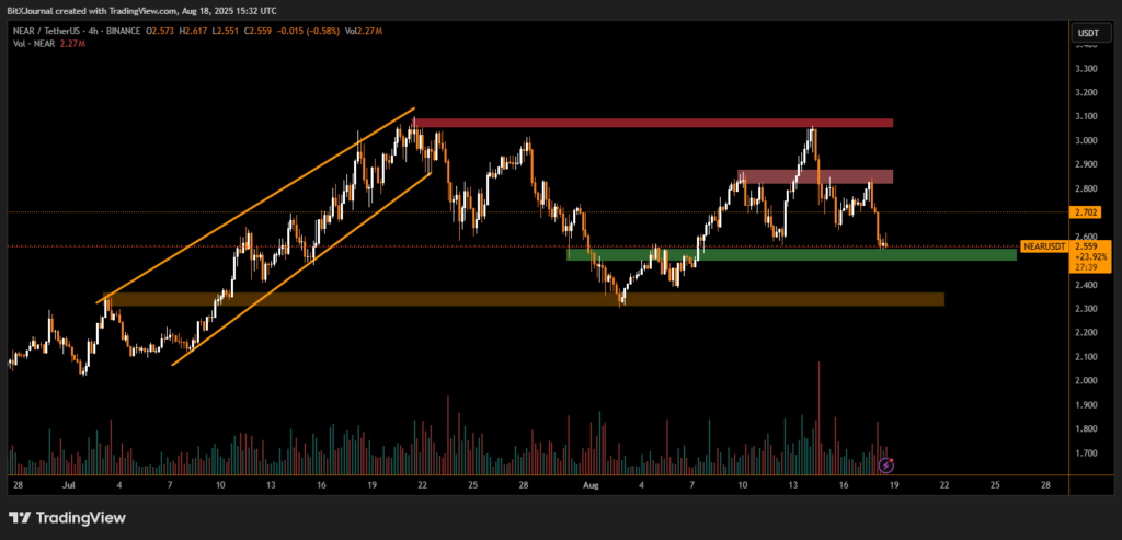 Over the past few weeks, NEAR attempted to establish bullish momentum, rallying above $3.00 before facing strong resistance. The rejection from this area has now pushed the token back into the $2.50–$2.60 support range, an area that has acted as a critical level since early August.