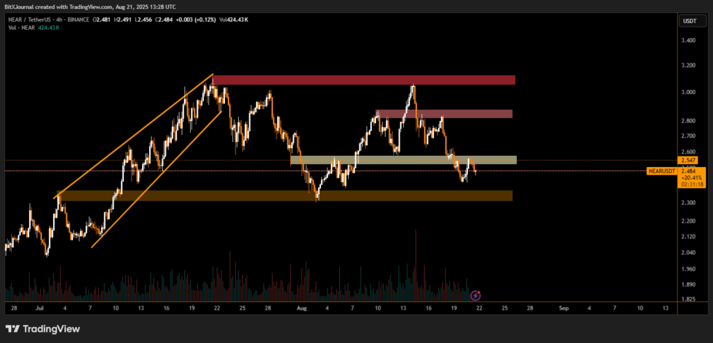 NEAR Protocol (NEAR) is showing signs of stabilization after a volatile few weeks in which prices surged above $3 before retreating. At the time of writing, NEAR trades around $2.48, hovering just below a short-term resistance zone at $2.55.