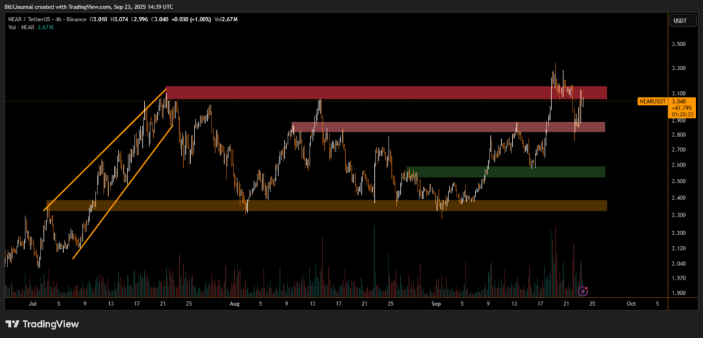 The 4-hour chart shows NEAR climbing out of a consolidation base with rising trading volumes. Following a sharp rally from $2.40 to $3.30 earlier in September, the token retraced toward $2.55 before recovering.