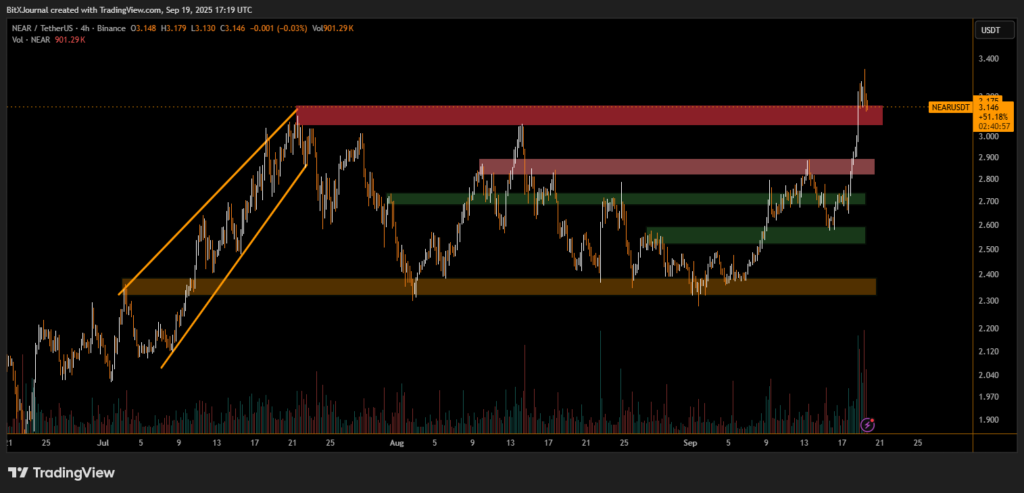 The 4-hour chart highlights a sharp breakout from the $2.40 accumulation zone, followed by a sustained uptrend that pushed NEAR through resistance levels around $2.70 and $2.90. The move was accompanied by a significant spike in trading volumes, underlining strong buying interest.