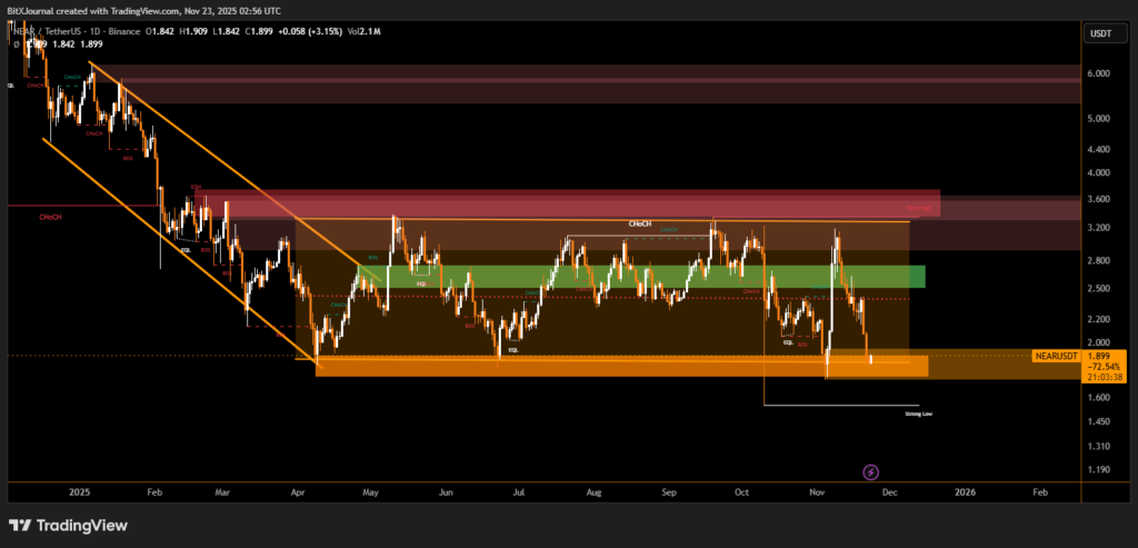 NEAR is struggling to hold its footing after another rejection from the upper boundary of its multi-month consolidation range. The asset continues to hover around the $1.90 level, testing a broad demand zone that has repeatedly acted as a base throughout the year. While the broader crypto market remains under pressure, NEAR’s chart now signals a decisive moment, with traders watching whether buyers can defend the final major support before a potential deeper slide.