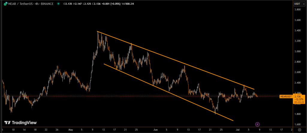 For much of July 7, NEAR consolidated in an ascending triangle pattern, with buyers steadily absorbing pressure near $2.16–$2.17. In the final hour of the session, price broke through the $2.19–$2.20 resistance zone, validating the bullish pattern and indicating potential for further upside.