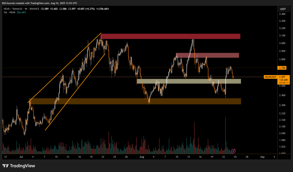 The chart shows NEAR breaking down from an ascending channel that fueled its rally toward the $3.10 resistance zone. After failing to clear this barrier, the token retraced, establishing a crucial support level at $2.50–$2.55, highlighted in grey.