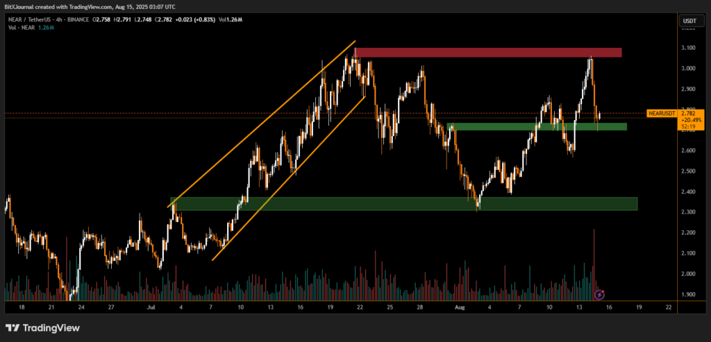 Despite the selling pressure, NEAR found strong buying interest near the $2.74–$2.78 demand zone, marked by a horizontal green support band on the 4-hour chart. This area had previously acted as a launchpad for late-July rallies.