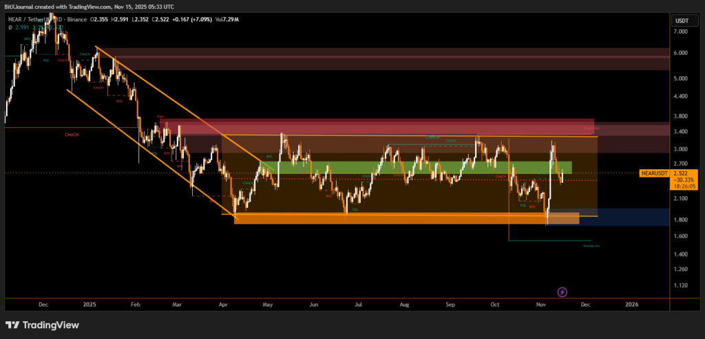 Within the range, NEAR continues to form equilibrium patterns and internal BOS signals, shown in tight consolidations around the green mid-range. This suggests an accumulation or distribution phase still in progress.