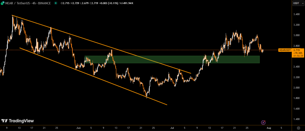 For most of the trading day, NEAR remained tightly confined within a narrow range of $2.67 to $2.86, a $0.18 bandwidth that reflected market indecision. This sideways price action spanned from 28 July 15:00 to 29 July 14:00, during which NEAR appeared to be forming a base.