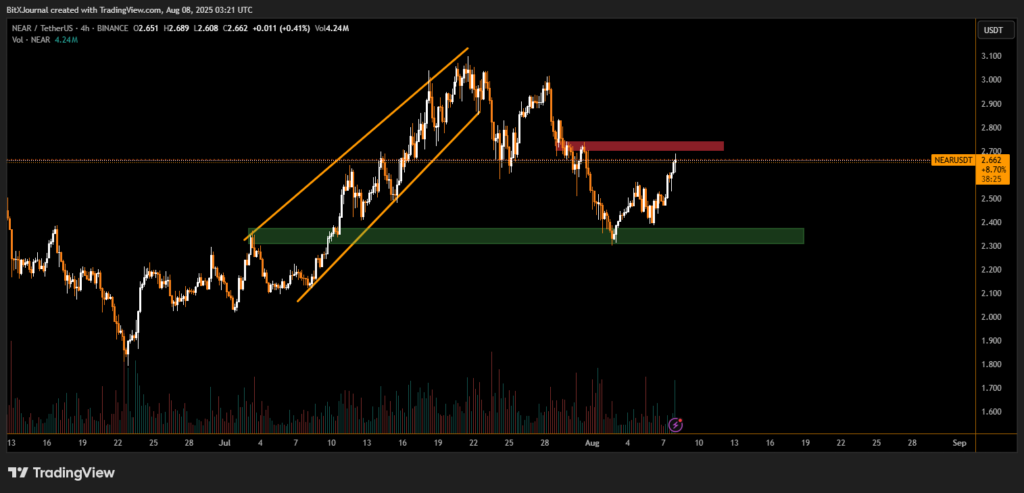 The latest 4-hour chart reveals that NEAR rebounded strongly from a key support band between $2.30 and $2.40, marked by a confluence of previous demand levels. The bounce came after a sharp decline from late July’s highs, when an ascending channel breakdown accelerated the downward momentum.