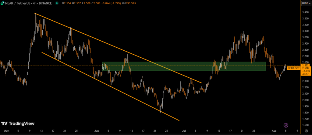 From August 3 to August 4, NEAR climbed from $2.43 to $2.53, with trading volume spiking above 2.7 million tokens—more than double its daily average. The move was largely fueled by institutional accumulation, which became especially apparent in the final trading hour as volume surged and resistance levels were decisively broken.