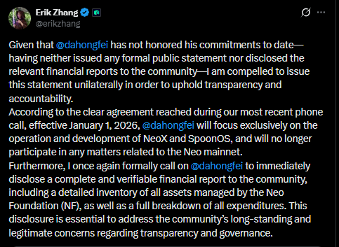 However, the restructuring plan depends on Zhang agreeing to transfer token holdings into a multisignature structure. Without consensus, Da indicated that the final decision may rest with the broader community as governance tensions continue to intensify.