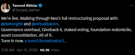 The dispute has escalated into competing restructuring proposals. Da Hongfei has called for relocating the Neo Foundation from Singapore to the Cayman Islands, introducing an independent five-member board, and excluding both founders from governance roles for a transition period. His plan also includes redistributing millions of NEO and GAS tokens to community holders to improve decentralization.