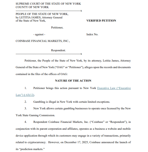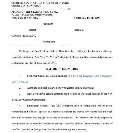The state of New York has filed lawsuits against Coinbase and Gemini, alleging their prediction market products violate state gambling laws. The legal action was announced by Letitia James, who argued that contracts tied to sports, entertainment and election outcomes function as unlicensed gambling products.