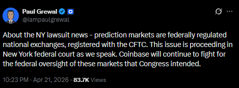 Paul Grewal stated that prediction markets operate as federally regulated exchanges and confirmed the company intends to challenge the lawsuit. Meanwhile, Mike Selig has argued that prediction markets fall under the Commodity Futures Trading Commission jurisdiction, not state gambling authorities.