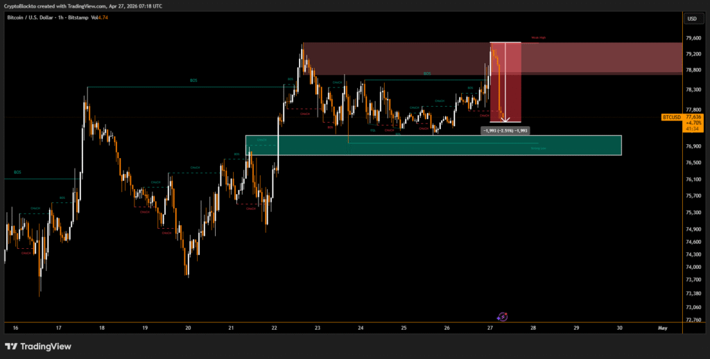 Bitcoin slipped after briefly touching a 12-week high near $79,400 before facing strong selling pressure during Asian trading hours. The move marked its third failed attempt in eight sessions to break above the $79k–$80k resistance zone, reinforcing the area as a key technical ceiling for traders. At the time of reversal, Bitcoin hovered around $77,600, …