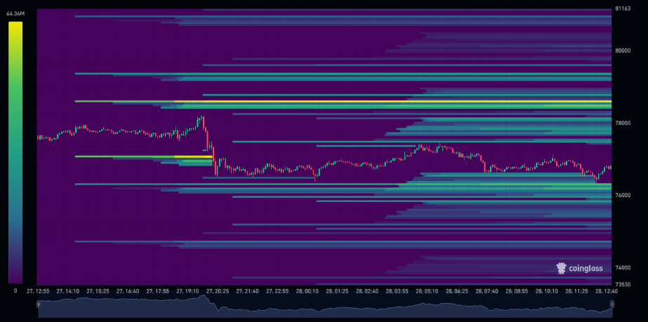 Despite rejection near $79,500, sustained price stability above key support suggests the possibility of a bear trap, where short sellers could be forced to close positions if momentum shifts upward.