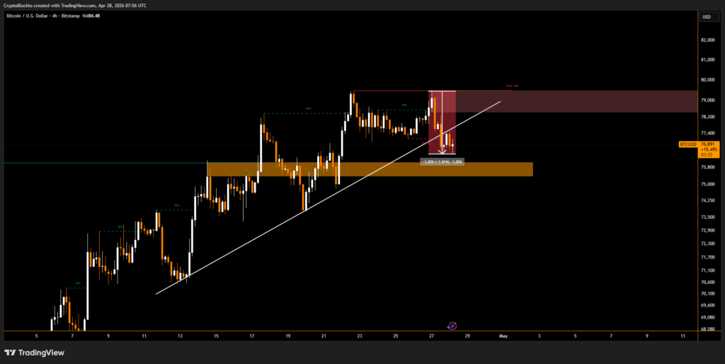 Meanwhile, spot demand continues to support price levels. Strategy purchased $255 million worth of Bitcoin between April 20 and April 26, while U.S.-listed Bitcoin ETFs recorded $824 million in net inflows, reinforcing bullish momentum that could drive a breakout above $80,000 if buying pressure persists.