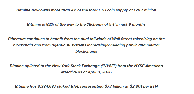 Beyond Ethereum holdings, BitMine reported combined crypto, cash, and investment assets valued at approximately $12.9 billion as of April 19, 2026. This includes around $1.12 billion held in cash reserves and 199 BTC in Bitcoin exposure.