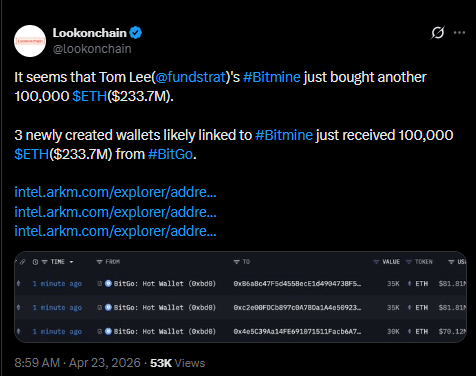 According to Arkham data, Bitmine now has approximately 3.5 million ETH staked, valued at around $8.1 billion, representing about 70.1% of its overall holdings. Reports also indicated that three newly created wallets linked to the firm received approximately 100,000 ETH worth nearly $234 million ahead of the recent staking move. If confirmed, Bitmine’s total Ether holdings could increase to about 5.08 million ETH, allowing the firm to control more than 4.1% of the total Ethereum supply and move closer to its long-term target of 5%.