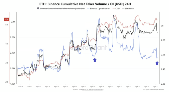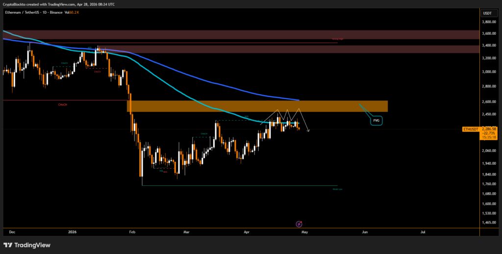 Ethereum fell 3.4% to $2,287 after failing to break the $2,400 resistance level for the fourth time since April 14, forming a clear triple top pattern on the daily chart. Each rejection showed weakening momentum, indicating sustained selling pressure at higher levels.