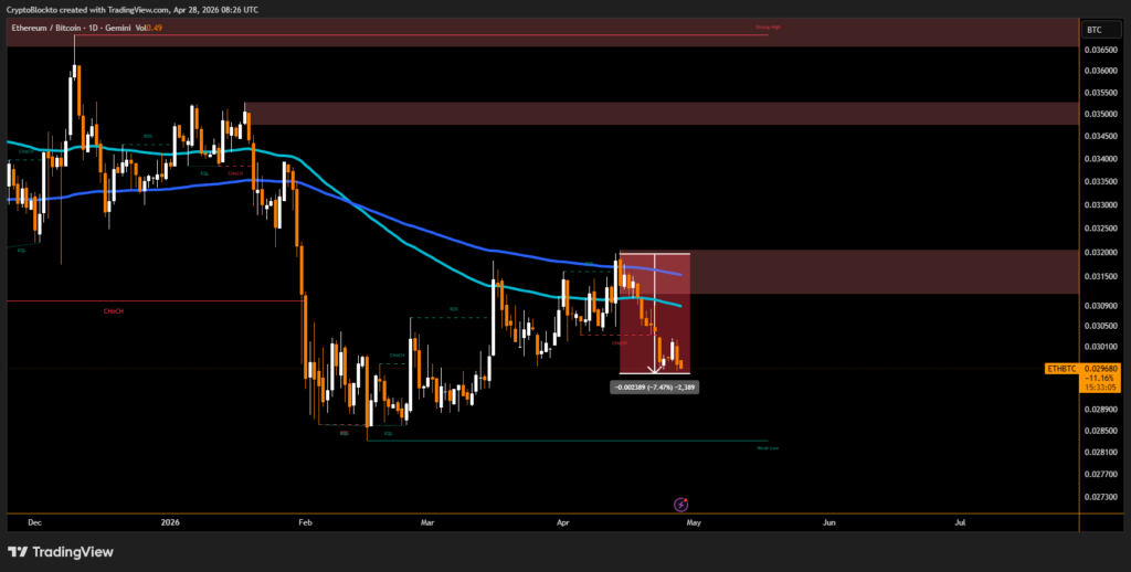 Ethereum’s relative performance against Bitcoin has also weakened, with the ETH/BTC ratio falling below 0.030 BTC and slipping under its 21-period moving average.