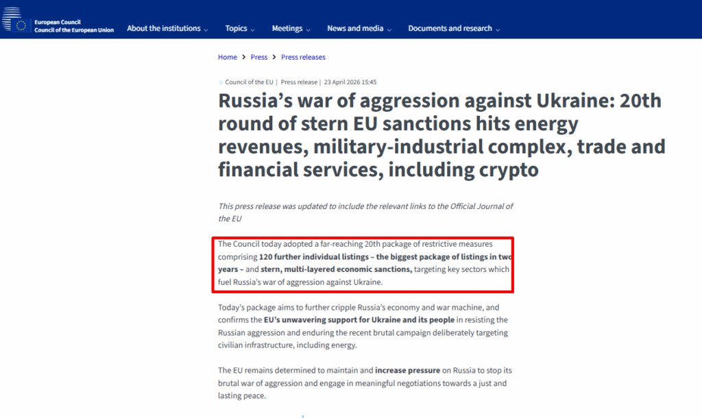 The European Union has announced its most extensive sanctions package against Russia in two years, tightening restrictions on financial channels and expanding measures aimed at limiting sanctions evasion through digital assets. The bloc stated that Russia has increasingly relied on crypto for cross border transactions, prompting stronger enforcement actions.