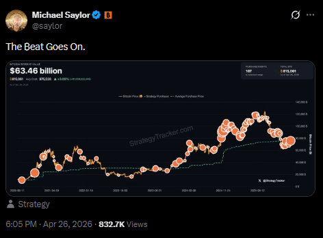 Despite reporting an unrealized loss of $14.5 billion in the first quarter of 2026 after Bitcoin fell from its October 2025 peak above $126,000 to around $60,000 in February, Strategy’s average acquisition cost remains near $75,528 per coin. With Bitcoin trading above $79,000, the company’s holdings have returned to profitability.