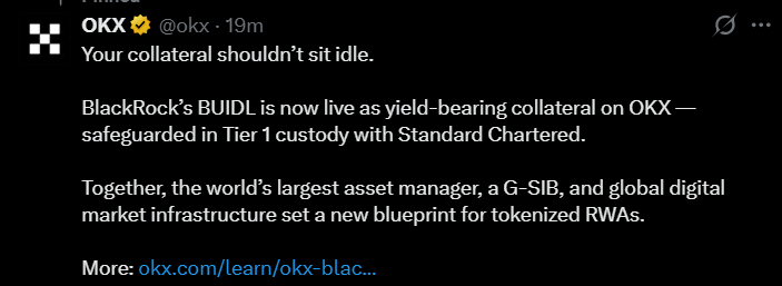 The move highlights a wider industry push to transform tokenized real-world assets into usable trading infrastructure. Rival exchanges such as Binance have also integrated tokenized treasury products, including BlackRock’s BUIDL and Franklin Templeton’s BENJI fund, into similar off-exchange collateral models.