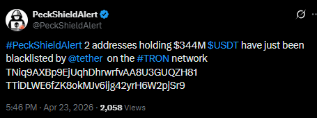 Tether has frozen more than $344 million worth of USDT across two Tron blockchain addresses after the wallets were flagged by U.S. authorities for suspected illicit activity. The freeze, confirmed on April 23, is considered one of the largest enforcement actions in the company’s history.