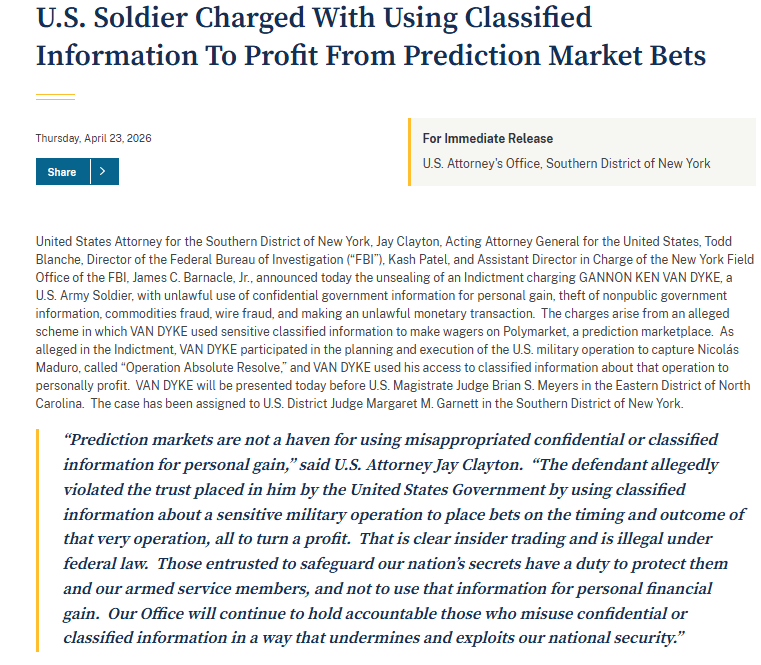 Officials noted that Van Dyke had signed nondisclosure agreements prohibiting disclosure of classified operational details. Regulators also warned that misuse of sensitive military intelligence for financial gain raises serious national security concerns and highlights risks linked to insider trading on prediction markets.