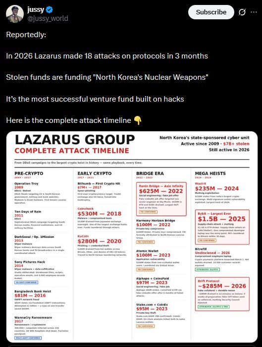Drift Protocol recently reported a $280 million exploit, attributing it to North Korean-affiliated actors. These attacks often involve third-party intermediaries using fully constructed identities, employment histories, and professional networks to gain trust. Tim Ahhl, founder of Titan Exchange, recalled interviewing a candidate later identified as a Lazarus operative.