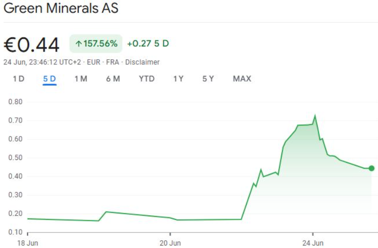 The announcement initially triggered a 300% surge in Green Minerals’ stock price, which closed at 68 euro cents on Monday. However, the price fell more than 34% on Tuesday, closing at 44 euro cents, according to Google Finance.