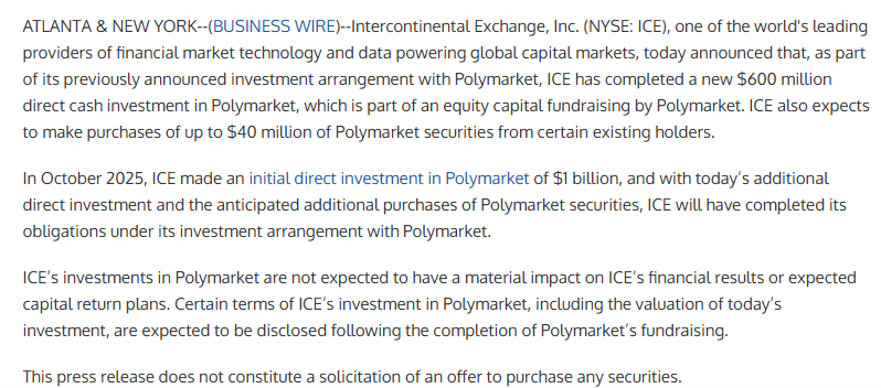 Intercontinental Exchange (ICE), the parent company of the New York Stock Exchange, has added $600 million to its investment in prediction market platform Polymarket, bringing its total commitment to nearly $2 billion. The funding completes a previously announced agreement and follows an earlier $1 billion investment made in October.