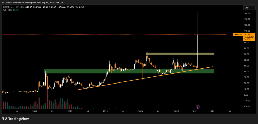 OKB, the native token of the OKX exchange, has recorded a historic price surge, skyrocketing from $46.57 to $103.58 within a single week — a gain of 122.32%. This move has propelled OKB to a new all-time high, surpassing its previous peak near the $72 level and confirming a strong bullish breakout from multi-year consolidation.