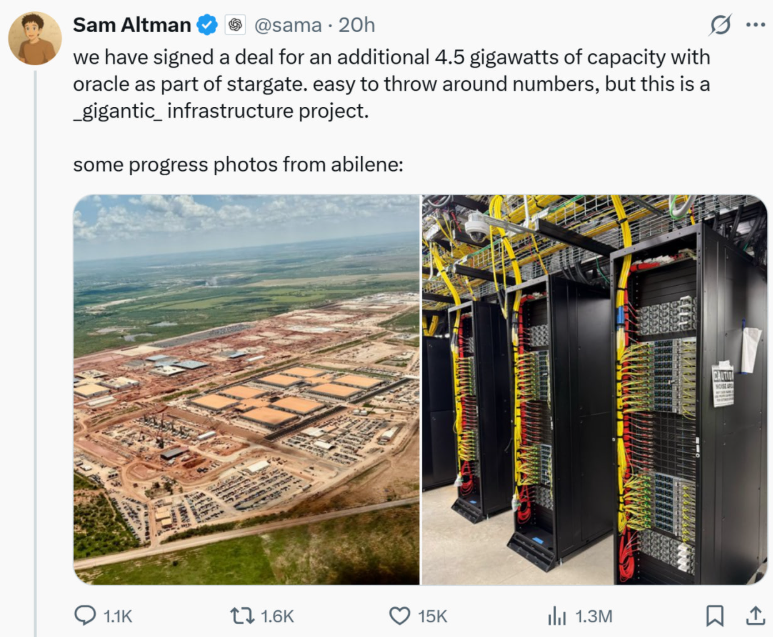 “This is a gigantic infrastructure project,” Altman said in an X post, sharing progress at the Abilene, Texas site.