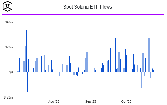 ETF data shows nearly $187 million in net Bitcoin ETF outflows and $136 million from Ethereum funds in just one day, while Solana ETFs continue to attract modest inflows — a sign that traders are rotating toward higher-risk assets despite broader weakness.