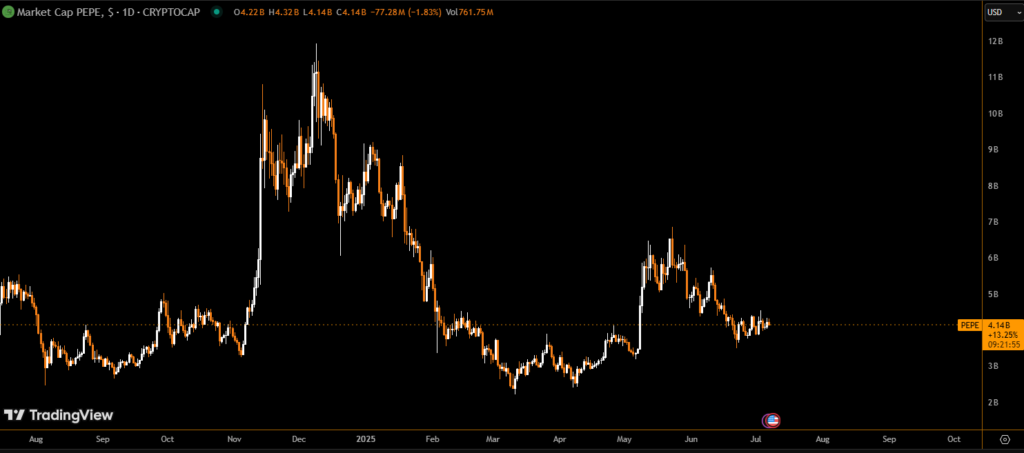 PEPE currently trades within a sideways consolidation range between recent lows on June 22 and July 2, and highs from June 25 to July 3. Unless PEPE breaks above this range, the downtrend from the May 23 high is likely to continue.