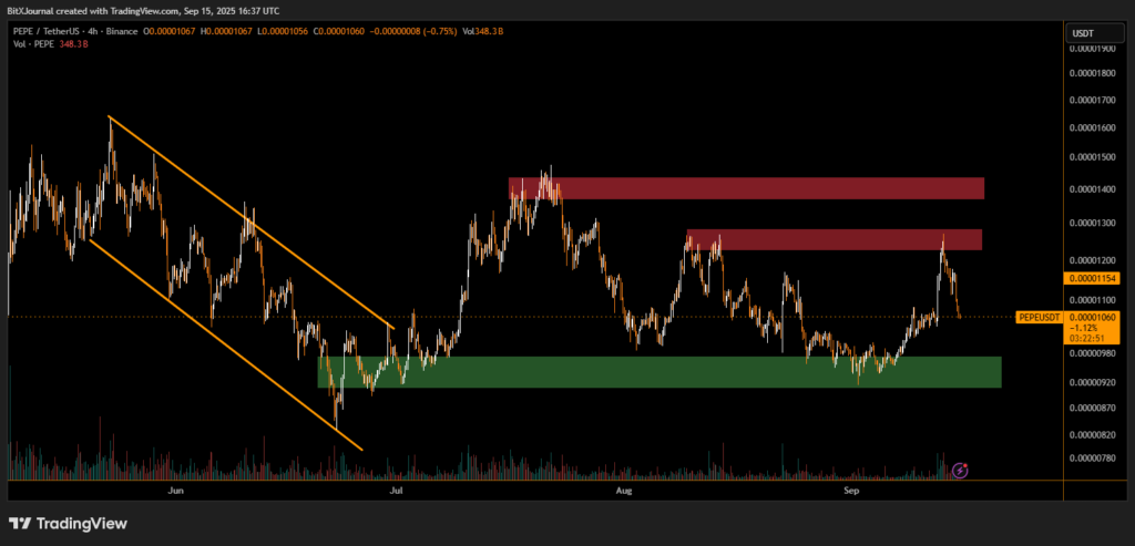 In the near term, PEPE’s price trajectory will depend on whether it can defend its support base. A bounce from current levels could bring a retest of $0.00001200, while a breakdown might extend losses.