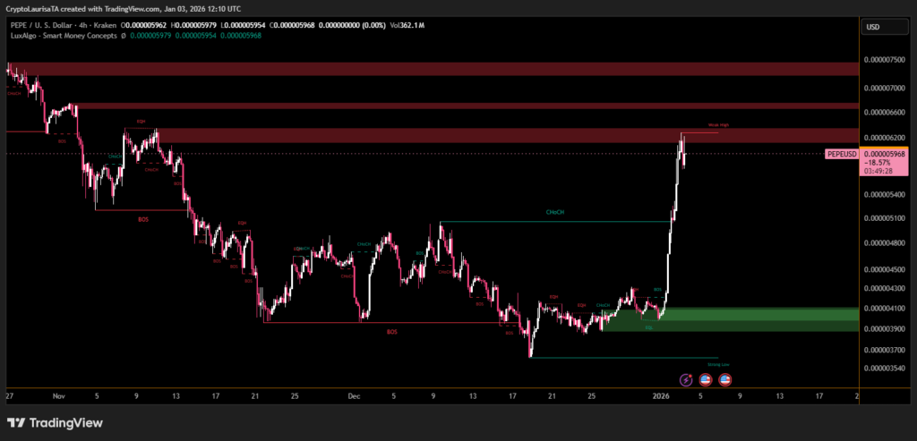 The crypto market has opened 2026 with renewed strength, led by a sharp rebound in memecoins and select altcoins following a subdued end to last year. Among the top performers, PEPE surged more than 30% in a single session, emerging as the clear leader of the memecoin resurgence during the post-holiday rally.
