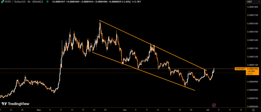 A significant technical milestone was achieved on July 2 as PEPE formed a golden cross, where its 50-day moving average crossed above the 200-day moving average. This rare event is often seen as a bullish long-term indicator, historically linked to sustained rallies in asset prices.