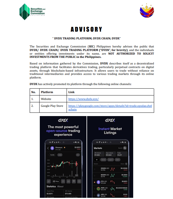 The Philippine Securities and Exchange Commission (SEC) has issued a public investor alert warning citizens against using several crypto trading platforms, including dYdX, citing lack of proper authorization. In a statement released through official channels, the regulator named dYdX, Aevo, gTrade, Pacifica, Orderly, Deriv and Ostium as platforms that are not registered to offer investment services within the country.