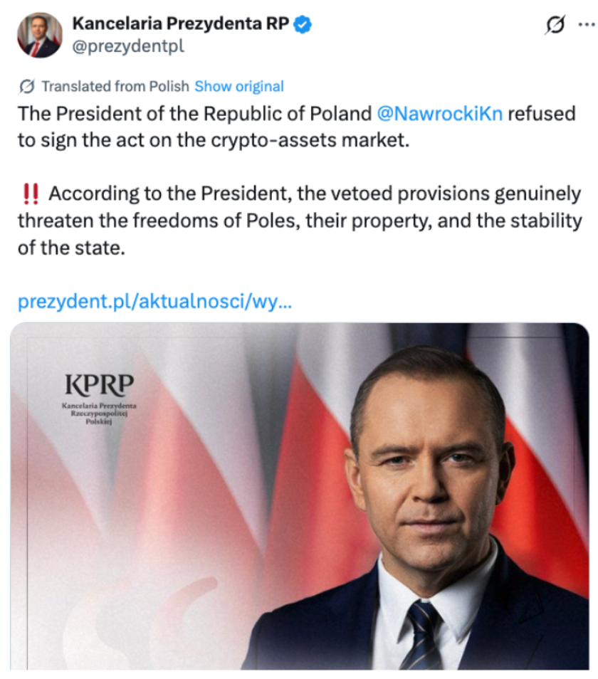 Nawrocki refused to sign the Crypto-Asset Market Act, saying its measures “pose a real threat to the freedoms and property of citizens.” The bill, introduced in June, would have imposed far-reaching controls on digital-asset firms, including a provision enabling authorities to block crypto-related domains with minimal oversight.