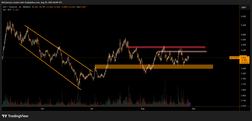 On the 4-hour timeframe, DOT previously broke above a prolonged downtrend channel, which dominated the market through June and early July. Following this breakout, the price surged toward $4.60 but failed to sustain momentum, resulting in multiple rejections near the $4.20-$4.40 resistance zone highlighted on the chart.