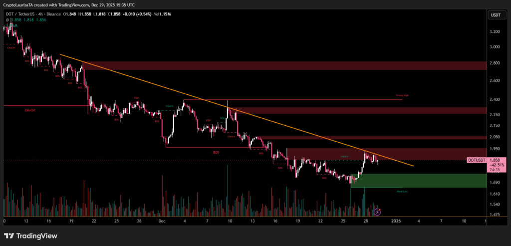 At the time of observation, DOT is trading around $1.84, marking a modest dip and confirming its underperformance relative to the wider market. Price action on the four-hour chart highlights a clear descending trendline, which has repeatedly capped upside attempts. Each recovery rally has been met with selling pressure, reinforcing the prevailing downtrend structure.