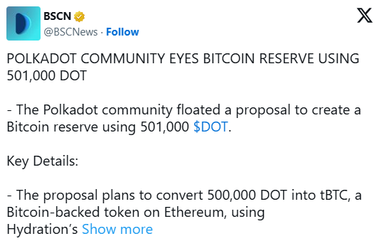 A bold proposal to convert 500,000 DOT (worth approximately $50 million) into Bitcoin has triggered an intense debate within the Polkadot community. Introduced by a community contributor, the plan seeks to diversify Polkadot’s treasury by gradually accumulating Threshold Bitcoin (tBTC) through a one-year dollar-cost averaging (DCA) strategy.