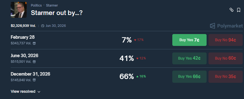 More than $2 million has been wagered on prediction contracts tied to whether Starmer leaves office by specific points in 2026. Current market pricing implies a roughly 41% chance that he steps down by the end of June and close to a 65% probability of an exit before year-end. These odds have climbed rapidly over recent days, highlighting shifting sentiment among traders as new political developments emerge.